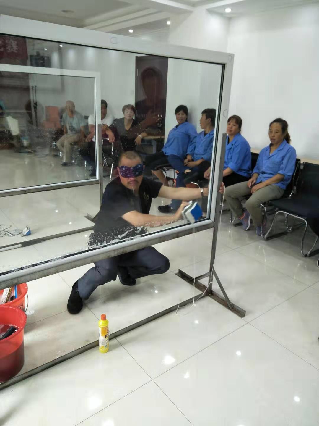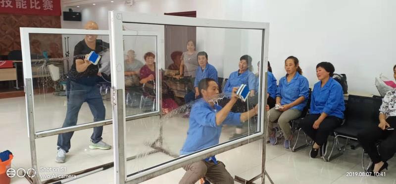 賽前,公司總經(jīng)理程晉軍、工會(huì)主席崔偉作了致辭動(dòng)員。比賽選手個(gè)個(gè)摩拳擦掌,躍躍欲試。首先進(jìn)行的是洗地機(jī)障礙演示技能比賽,比賽過(guò)程中每個(gè)選手都能嫻熟地安全避過(guò)比賽設(shè)置的障礙并能按正規(guī)操作章程進(jìn)行,展示了過(guò)硬的操作技能;在高空外墻清洗安全防范實(shí)際演示過(guò)程中,穿工衣、帶安全帽、系安全繩以及放繩整個(gè)過(guò)程細(xì)致到位,一氣呵成;接著大家期盼的蒙眼擦玻璃賽將技能比賽推向了高潮,這是最富觀賞性的比賽,大家在佩服選手熟練的手法和技巧時(shí),也對(duì)工程部對(duì)于服務(wù)質(zhì)量和技術(shù)的高要求感到敬佩。比賽中洋溢著歡歌笑語(yǔ),公司副總經(jīng)理張永智對(duì)比賽進(jìn)行了實(shí)時(shí)精彩的點(diǎn)評(píng)。