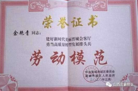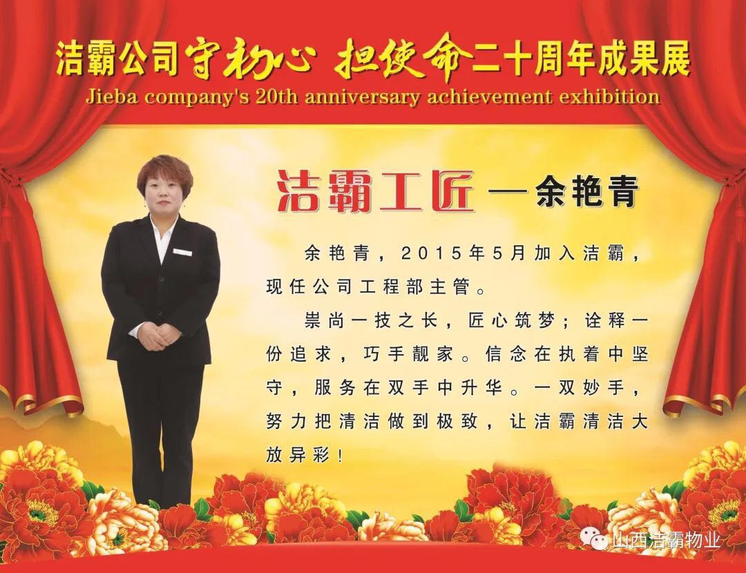 余艷青同志自2015年進入潔霸以來,一直奮斗在工程部的第一線從事主管工作。工作中,余艷青同志愛崗敬業(yè),遵守職業(yè)道德,為人誠實守信;她熱愛工作,對待客戶熱情周到、耐心細致;工作中團結(jié)同事,責(zé)任心強,吃苦耐勞,服從大局,以公司的利益為重。在我市開展的“三洗六見一紅旗”活動和全國文明城市的創(chuàng)建活動中,她帶領(lǐng)員工高標(biāo)準(zhǔn)、高質(zhì)量、高效率地完成清洗美化工作,為扮靚晉城形象,打造城市優(yōu)美環(huán)境做出了突出貢獻。先后多次被公司評為優(yōu)秀員工等,2019年在公司成立20周年慶之際,她又被公司授予“潔霸工匠”稱號。