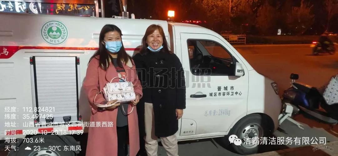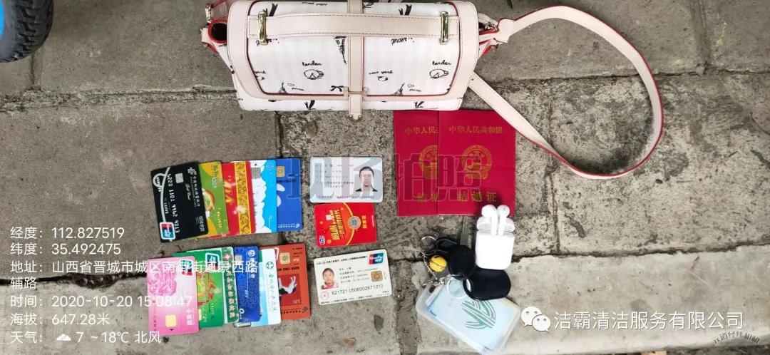 10月20日下午3點(diǎn)左右,晉城市潔霸清潔服務(wù)股份有限公司保潔部環(huán)衛(wèi)經(jīng)理李通和工人在城區(qū)南街街道景西路段進(jìn)行街道清洗作業(yè)時(shí),忽然看見晉城農(nóng)商銀行門前的綠化帶里有一個(gè)女士挎包,忙叫環(huán)衛(wèi)工人郭志云把挎包撿了起來(lái)。當(dāng)時(shí)就考慮到失主丟失挎包以后一定很著急,在同事的共同見證下他們打開挎包,經(jīng)過(guò)查看,發(fā)現(xiàn)挎包內(nèi)有一張王女士的身份證、社保卡及銀行卡數(shù)張,還有結(jié)婚證、鑰匙、耳機(jī)、富士康工牌等物品。憑借富士康工牌上的工號(hào),他們給富士康打電話聯(lián)系到了失主,后由環(huán)衛(wèi)主管秦彩鳳將挎包交到失主手中。收到失而復(fù)得的挎包,王女士又驚又喜,感激萬(wàn)分。