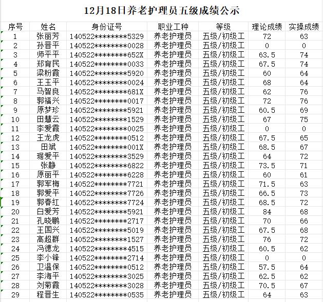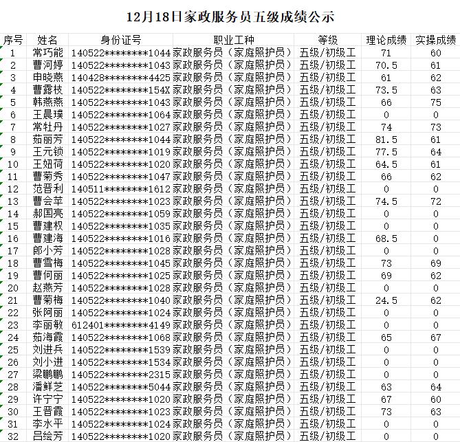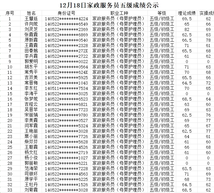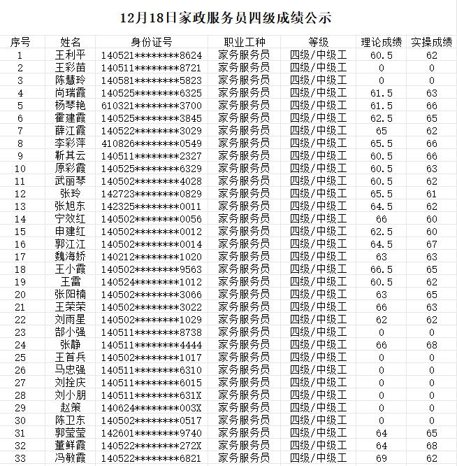 晉城市潔霸清潔服務(wù)股份有限公司職業(yè)技能等級(jí)認(rèn)定中心現(xiàn)將2023年12月18日認(rèn)定人員成績(jī)公示如下: