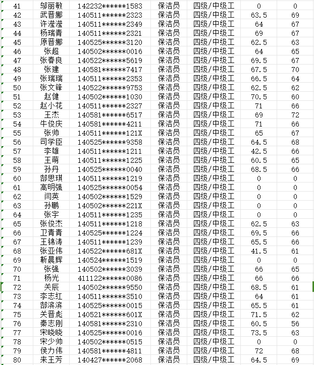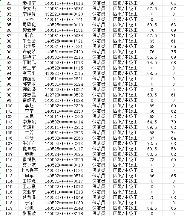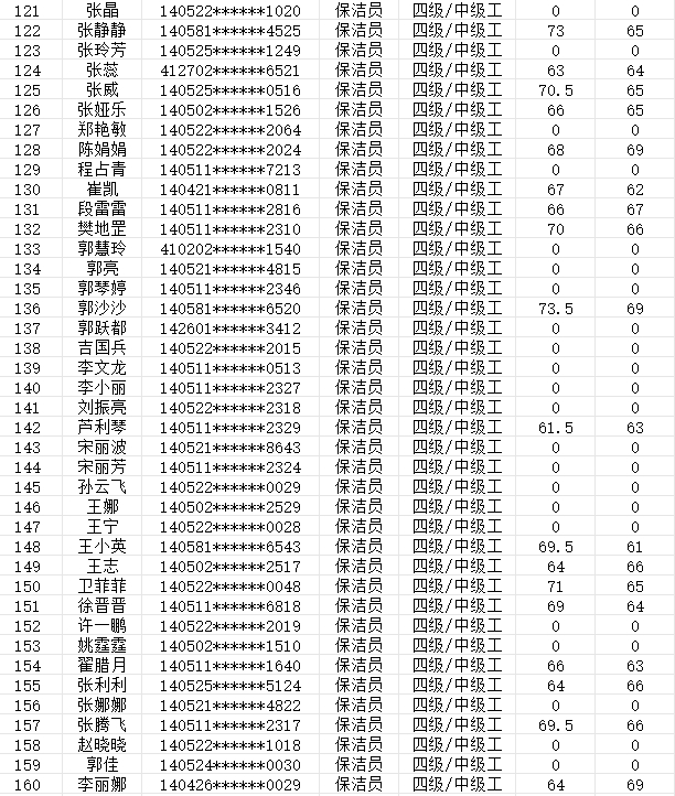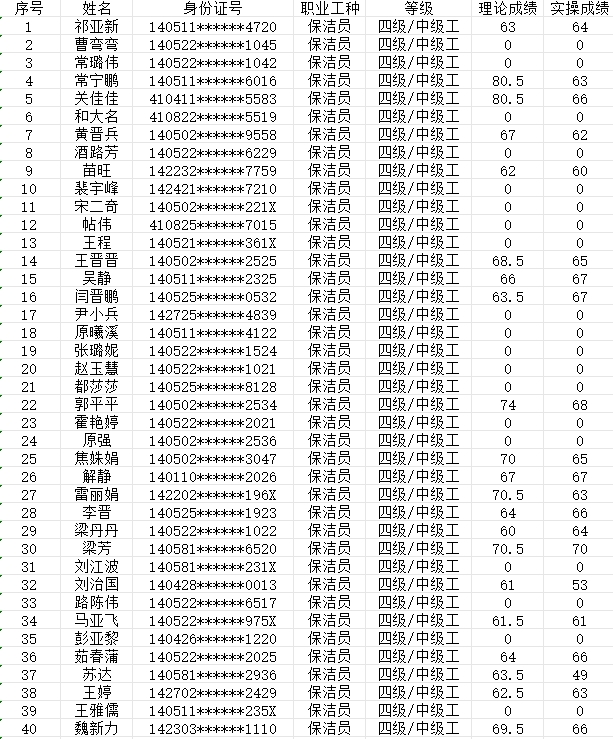 晉城市潔霸清潔服務(wù)股份有限公司職業(yè)技能等級(jí)認(rèn)定中心現(xiàn)將2024年2月3日認(rèn)定人員成績公示如下: