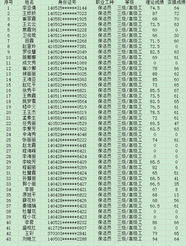 晉城市潔霸清潔服務股份有限公司職業(yè)技能等級認定中心現(xiàn)將2024年5月12日認定人員成績公示如下: