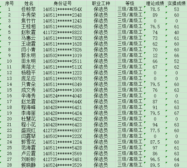 晉城市潔霸清潔服務(wù)股份有限公司職業(yè)技能等級認定中心2024年5月19日第16批保潔員高級認定人員成績公示