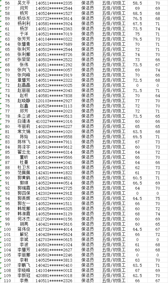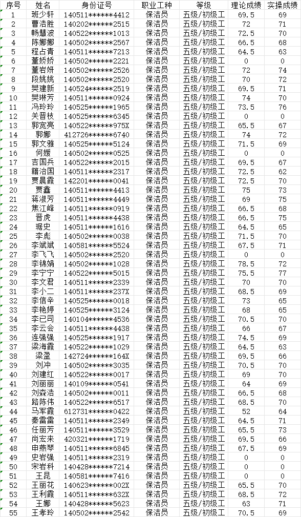晉城市潔霸清潔服務(wù)股份有限公司職業(yè)技能等級認(rèn)定中心現(xiàn)將2024年7月27日認(rèn)定人員成績公示如下: