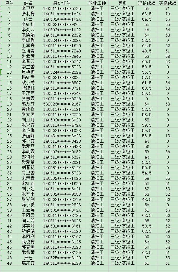 晉城市潔霸清潔服務股份有限公司職業(yè)技能等級認定中心2024年8月3日第8批保潔員高級認定人員成績公示