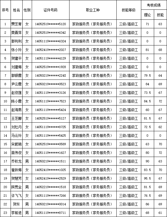 山西潔霸清潔服務(wù)集團股份有限公司職業(yè)技能等級認(rèn)定中心2025年8月30日第1批家政服務(wù)員(家務(wù)服務(wù)員)高級認(rèn)定人員成績公示